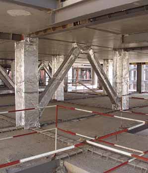 С помощью использования систем огнезащиты железобетонных конструкций можно повысить предел огнестойкости, добиться повышения прочности металлических элементов при нагрузке и предотвратить выгорание большой площади конструкции, частичное или полное повреждение бетона и остановить распространение пожара. Существуют различные подходы в организации огнезащиты железобетонных конструкций, которые должны зависеть от расчета таких показателей, как марка бетона, арматурное наполнение, размер конструкции, погрузка, влажность бетона в условиях эксплуатации, наличие армирования из металла.